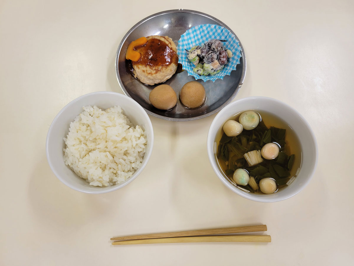 お月見ハンバーグ、里芋の煮物、ひじきの豆サラダ、ごはん、すまし汁