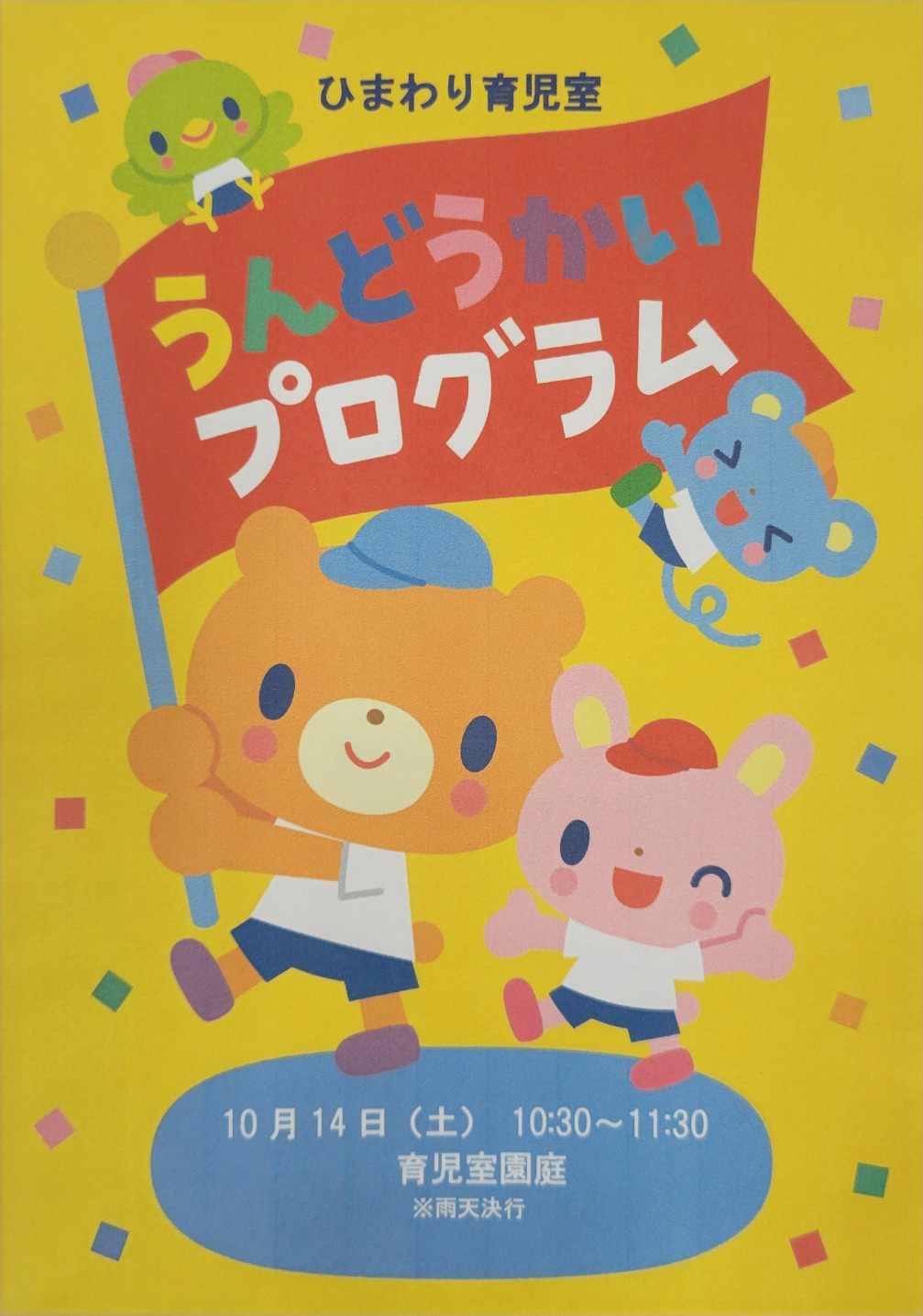 体操、障害物・親子競技など、それぞれのクラスのお気に入りの曲、プログラム内容で「ジャングルジムに登れるよ!」「平均台だって渡れる!」「エビカニクスで踊っちゃおう♪」と、いつもの保育園での遊びをお父さんお母さんに見てもらうことができて、笑顔いっぱいの子ども達でした。